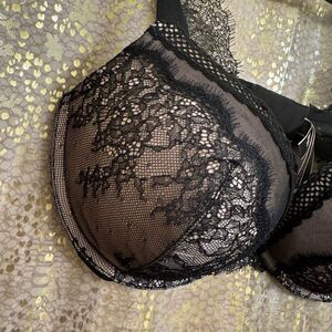 Great gently used condition, smoke and pet free home. No major flaws or signs of wear. Gorgeous black eyelash lace over a nude colored bra cup. Lots of padding, this will for sure lift you up a couple sizes. No longer sold.