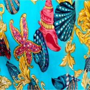 Vintage Victoria's Secret Gold Label 100% silk open back mini slip dress. Bright teal/aqua with sea shells, sea creatures and gold scrolling design. Retro glam from early 90's. Adjustable double spaghetti straps, V-neck, open/low back.