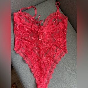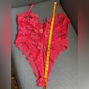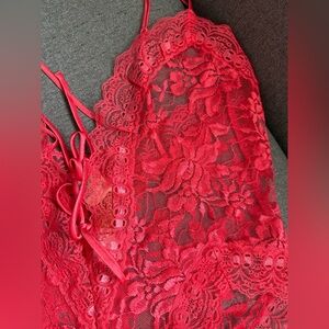 Stunning scarlet lace bodysuit with intricate floral design. Ideal for making a statement.