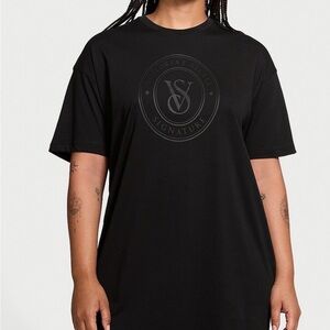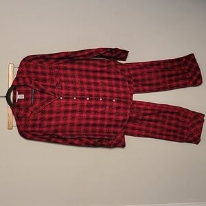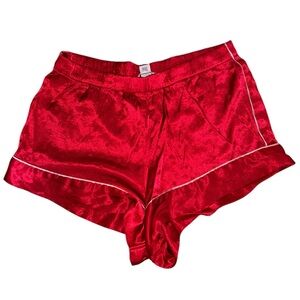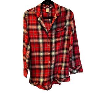 Keywords: Victoria's Secret, satin sleep shirt, red lingerie top, button front nightshirt, satin pajama top, black trim, embroidered detail, nightwear, loungewear, sleepwear, retro lingerie, vintage nightgown, M/L size