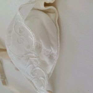White swirl print vintage 3-piece bra, corset, and garter belt set. Bra is underwire with built in gel pads and adjustable straps. Small dot on 1 side on the inside of bra. Please see pictures. This cannot be seen when worn. Corset is a nylon blend with underwire, 10 hook back closure, and adjustable straps. Garter belt has a 1 hook closure. Both these pieces have only been stored.