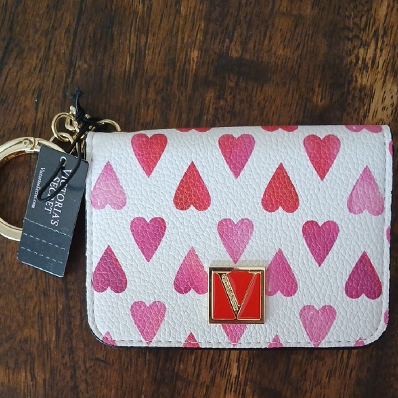 Elegant wallet with pink heart pattern. Features gold accents and signature logo. Ideal for daily use.