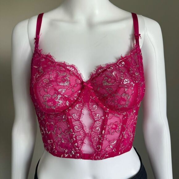 Victoria’s Secret Wicked Shimmer Lace Hot Pink Corset Too, From The Dream Angels Collection, Allure Floral Lace With Metallic Silver Threads, Boning Throughout, Light Push Up Padding And Underwire, Adjustable Straps And Back Hook And Eye Closure, Size Small, New No Tags!