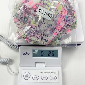 Color/Pattern: White base with neon pink, yellow, purple, aqua splatter pattern and scalloped trim