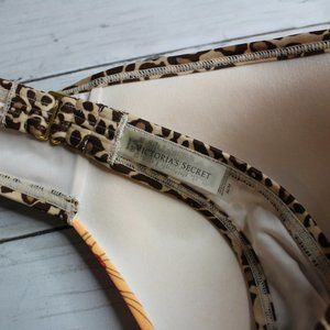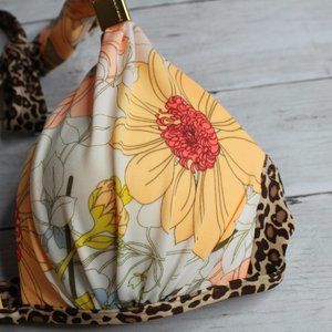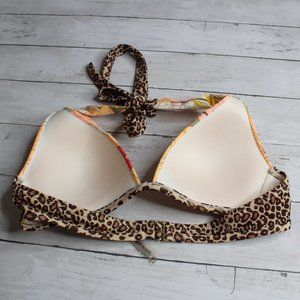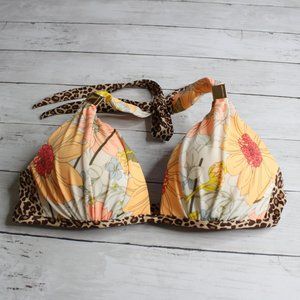 This swimsuit top is really nice quality. It is off white with multiple shades of orange, blue, yellow and coral flowers with contrasting brown animal print. It has molded cups that are padded with extra padding that lightly lifts breasts. The bottom of the cups have delicate pleated gathers that drape over the cups. It has halter straps with square gold-tone metal hardware and a bra band that fastens in back with a gold-tone metal fastener. It is in excellent near to new condition. I think you'll love it!