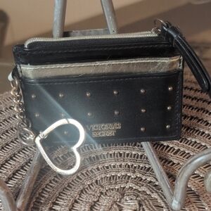 Inner credit card slots under snapped flap. Exterior slip pocket. Zippered top closure for interior pocket with heart key zipper pull.