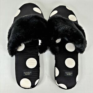Victorias Secret Womens Slippers Size Medium Black Polka Dot Memory Foam Fuzzy