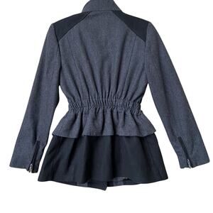 This cute coat is in Very good condition; no holes, pilling, snags or stains. 63% wool, 24% polyester, 6% acrylic, 7% other fibers. Lining is 100% polyester. Black and gray in color with a zip/snap button front closure. chest is 18" across, waist is 13.5" across, length is 28", sleeve is 17", so cute!
