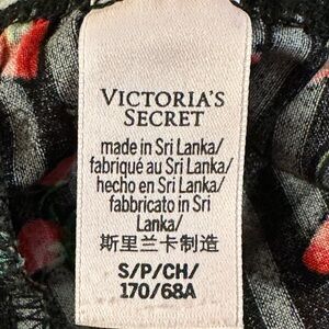 Stay comfy and stylish in this Victoria's Secret pajama set featuring a black short-sleeve graphic tee with a floral VS logo print and matching strawberry-print shorts with an elastic logo waistband. This trendy lounge set is perfect for sleepwear or lounging in style.