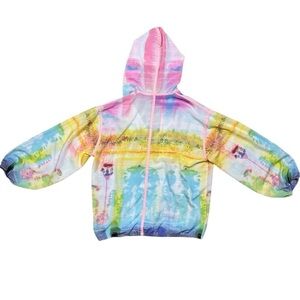 This Victoria's Secret lightweight windbreaker jacket is designed for women in size small. Made from polyester, it features a multicolor tropical pattern with a relaxed fit. The jacket includes a hood, front pocket, and elastic hem, making it suitable for casual occasions across spring and summer. It has a long sleeve design and a drawstring closure, and is machine washable for easy care. The jacket is pre-owned.