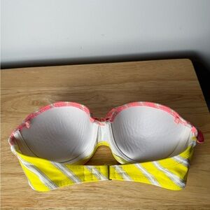 Victoria’s Secret, bikini top, Y2K swimwear, strapless, pink and yellow, summer fashion, beachwear, poolside, trendy, flattering fit, size 32C, women’s swim top