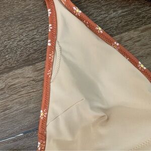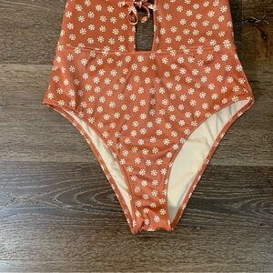 Victorias Secret Womens Rusty Orange Daisy printed plunge / tie neck one piece swimsuit // no padding but does have opening for padding