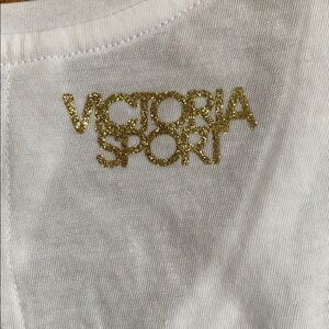 White Victoria Sport Train Like An Angel top with gold decor. Open back and ties at bottom. Measures approximately 16” across chest and 24” from shoulder to hem. 60% cotton/40% polyester. NO TRADES
