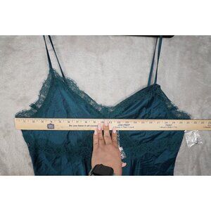 Description:Indulge in luxurious comfort with this stunning teal satin lace romper from Victoria's Secret. Designed with delicate floral lace trim along the neckline and waist, this one-piece combines elegance with comfort. The soft satin fabric drapes beautifully, while the adjustable spaghetti straps ensure a perfect fit. Flowy hemline adds a flirty touch — perfect for lounging or as a chic sleepwear piece!