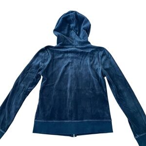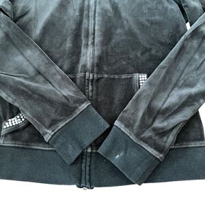 Vintage Y2K Black velour pant set with rhinestone bling accents. Zippered hoodie with pockets, elastic drawstring low rise flared leg pants with back pockets. Some wear as shown. In GUC.