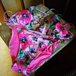 Beautiful 2 pieces swimsuit from VS. Colorful and accented with gold chains, it has adjustable bra strings and removable pads. The bottom still has hygienic liner. Check the last pic.
