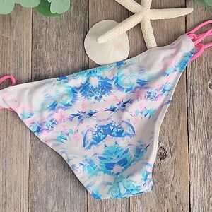 The knockout bikini bottom separates in an abstract pink and blue print. Good pre-owned condition. Normal signs of wash and wear.