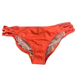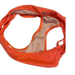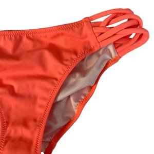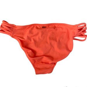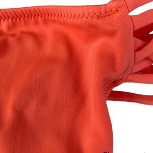 This orange colored extra small bottom has fun braided straps on the side. It has the pink logo on a metal tag on the back. No signs of wear