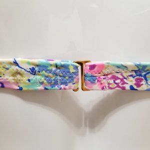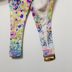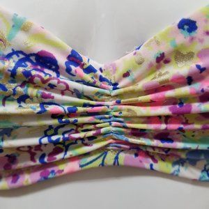 Multi-color floral strapless bandeau bikini top. Ruched bust. Metallic foil accents. Halter strap convertible -- does not come with a strap. . One hook closure, three lengths. 2014. Swim, beach, summer vacation, Spring Break, pool, stretch.