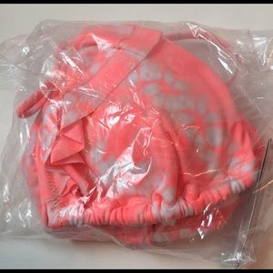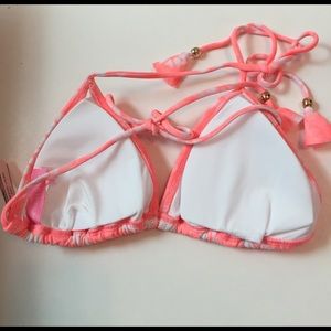 Victoria's Secret flounce tiny triangle bikini top. Colors are melon and white print. Gold charms on tassels. Removable pads. Brand new with tags. Ships on original plastic bag. Check out my other listings for Victoria secrets bottoms.