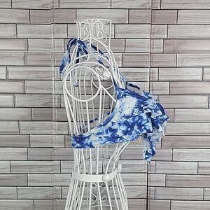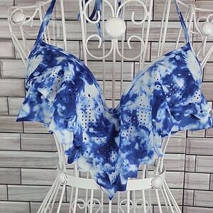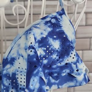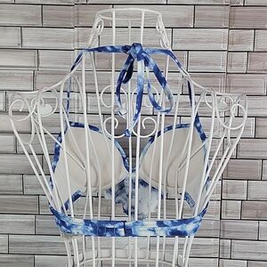 Blue and white watercolor print bikini top with scarf overlay and padded cups. Good pre-owned condition.