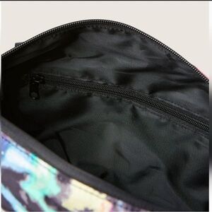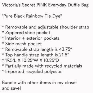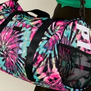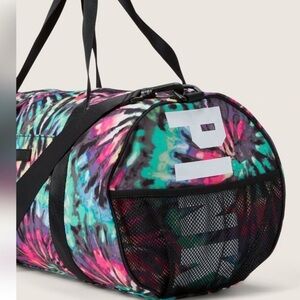 Brand new without tags, this is a Victoria’s Secret duffel bag that is really nice. It has a mesh pocket on the one side where it says pink and then the opposite side is a zipper pocket that actually has fabric that extends into the bag that you can keep your shoes in to keep them away from your other items. Beyond that is a wide open interior space and there is a zipper pocket on the one side. On the outside there is a slip pocket for your phone right where the pink logo is. Zipper top, carry handles and adjustable shoulder strap. Super cute tie-dye design with great colors. New without tags, make this yours today. See photos for dimensions.