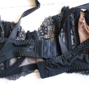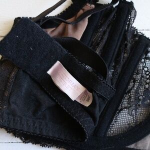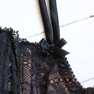 black lace, boning through the cups, dainty bows, very sexy style, ideal for special occasion lingerie