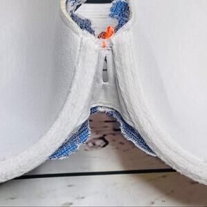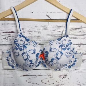 Victoria's Secret lined perfect coverage bra. Blue white lace orange neon bow. Underwire, padded, 2 hooks 4 settings, adjustable crossable straps, sheer back band. Light pilling- see pictures. Size 36C