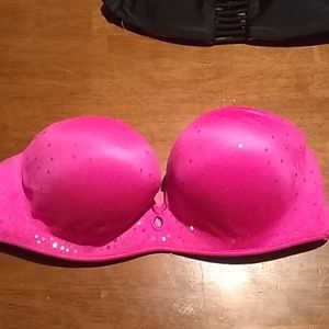 This bra is in great condition, but is used I took off the straps as well. Pink with silver sequence.