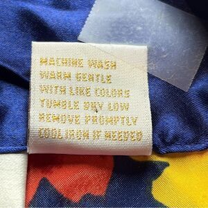 Excellent condition. Beautiful colorful robe, pink/yellow, orange with blue base and trim. Open front with belt. Side pockets, lower side slits. 3/4 sleeve.