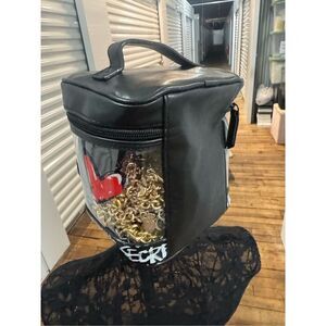 Victoria Secret contrast pvc white and black & pink make up/beauty/skin care train case chic vertical pvc plastic/jelly w: vs logo heart chalk graffiti angel wings & a red heart scribble.doodle