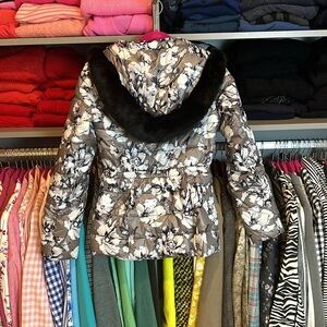 Victoria’s Secret gray/white/black flowered faux fur hooded puffer coat size XS