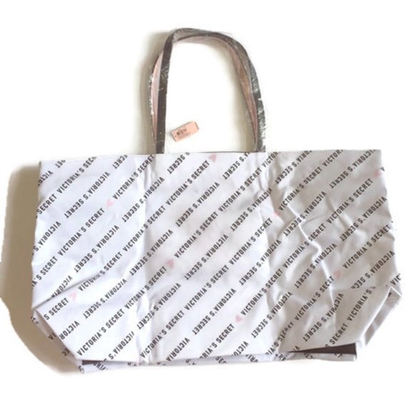 Victoria’s Secret white canvas large tote bag. Pink and black handles with zip middle closure.