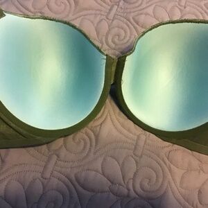 Size 36DD, green, lace on cups. Can wear straps straight or criss cross in back. Worn once, no tags.
