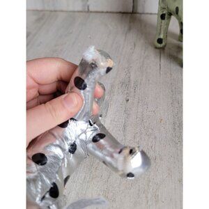 Product silver dog has small bite marks visible and front paws have tears sold as is, otherwise is in good condition, no significant scratches or damage, set of 3