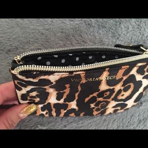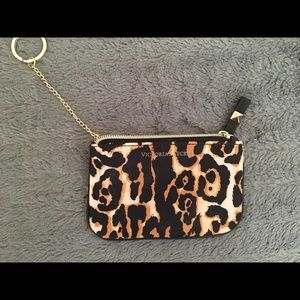 Adorable leopard print mini clutch! Has a chain with key ring attached so you can put your keys on it or attach it to a larger purse! It has gold metal accents and a polka dot fabric interior.