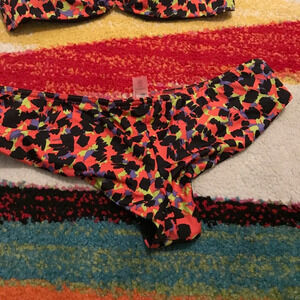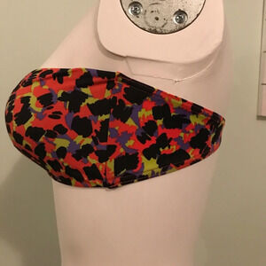 Strapless top is a size medium. Gold clasp. Bottoms are a size small. Fully lined. Pretty black and coral print.