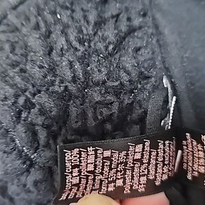 Black jacket. Does attract lint, I've tried to pull off as much as I can. Has some minimal signs of wear. Ribbed band at bottom and at wrist. Teddy bear style jacket. Oversized. Has large VS in the back. Fall, autumn, girly, feminine, comfy, solid color, cute, casual