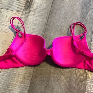Excellent used condition bra made by Victoria’s Secret —2 hook and eye closure in the back- bright pink /underwire, bra, Adjustable thin straps. Sexy little things style. Size 32C — half of the shoulder strap is double strap with black bow decorated accent.