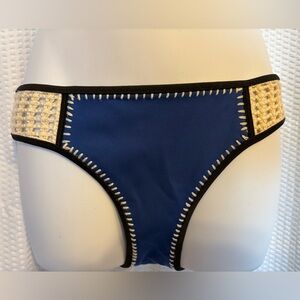 Blue bottom with crochet sides is a size medium. Waist measurement is approximately 31”. Excellent used condition.