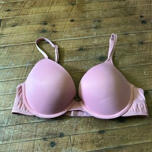 Victoria’s Secret pink, thick band, wear everywhere , push-up bra. In good, used condition. Minor wash wear. From a pet and smoke free house.