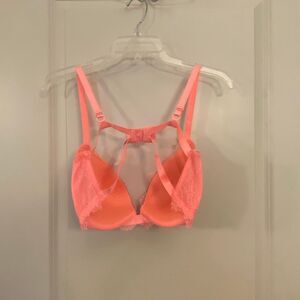 Victoria’s Secret bra this is the push-up bra size 36DD by Victoria’s Secret. The color is like a neon pink color in good preowned condition normal wear and tear. There is wear under the armpits and a little discoloration under the armpits See pictures for more details.
