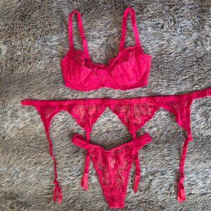Victoria's Secret red lace 3-item set. 34C bra, thong & garter