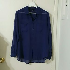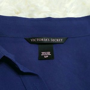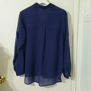 Victoria's Secret sheer button down blouse top. Size S/P. Button down front. Roll up sleeves with button tab. High low hem detail. Two front pockets. In cobalt blueish purple color. Loose fitting and roomy. No flaws.