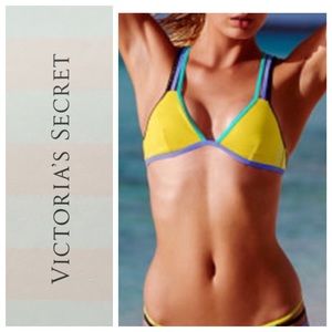 Victoria's Secret strappy crossback triangle bikini top, size large. Olive oil with contrast neon trim and straps. Removable pads. Comfortable support and so cute! New in packaging. Model pics from VS website. Note that the straps in back are black, blue and teal, the model is to show strappy back.