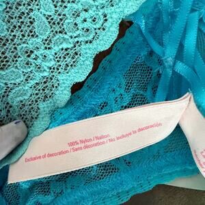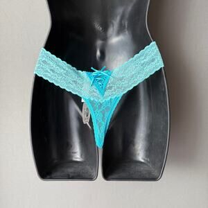 This is a Victoria's Secret lace thong, new with tags. The garment is made of 100% nylon and features a delicate floral lace pattern in two shades of turquoise. The thong has a low-rise design with a narrow waistband and minimal back coverage. A small decorative bow is present at the front. The item is in pristine condition, with no visible imperfections.