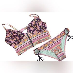 Victoria’s Secret tankini bikini paisley pink, purple, mint swimsuit set. Size M. This suit is like new! The top has removable light padding cups, a front zipper, and adjustable straps. The top is missing the size tag, so I included pictures of measurements. I would say it lines up with a medium measurement but see pictures to be sure.