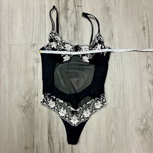 New without tags vintage 90’s Victoria’s Secret teddy in stretchy black mesh, snap thong crotch, and cream floral embroidery accents. Unlined. Adjustable straps as shown. Unlined underwire cups size 36 C. Has been in storage since purchasing. Super sexy and feminine! Measurements in photos.