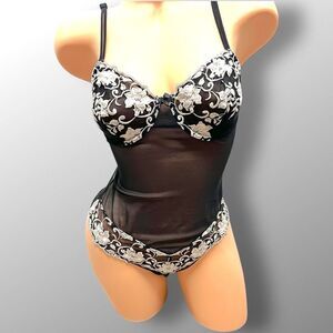 Victoria’s Secret teddy black mesh cream embroidery underwire sz36C NWOT vintage