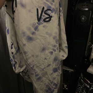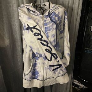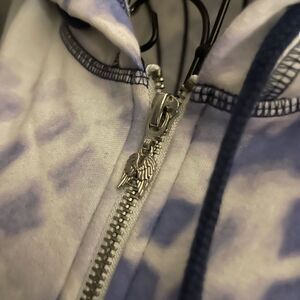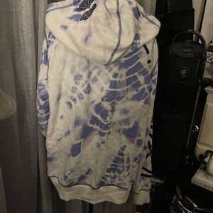 Blue & white tie dye full zip up hooded sweatshirt w/signature angel wings on hood & zipper pull(supermodel essentials- angel wear line) & logo going down sleeve sz XL
